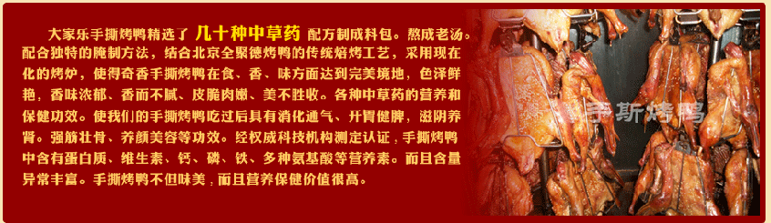 穿骨香手撕烤板鴨:久久鴨、鴨脖、鴨翅、鴨掌、鴨舌、鴨肝、鴨腸、翅尖、 鴨胗、鴨頭、鴨架、八道精美涼菜。(實(shí)際操作)