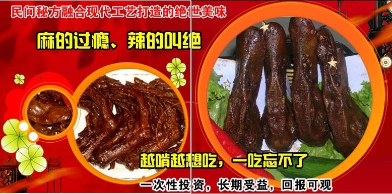 怪味黑鴨子,秉承六朝佳節(jié)精髓,吸收現(xiàn)代生產(chǎn)工藝之精華,結(jié)合“川渝鄂”人的口味,以獨(dú)特“腌、烤、鹵”等現(xiàn)代工藝,制作配以多種純天然綠色中草藥、全面導(dǎo)入香鹵、辣鹵、麻鹵等現(xiàn)代鹵味工藝,秘制出享譽(yù)武漢三鎮(zhèn)的金牌食品! ????