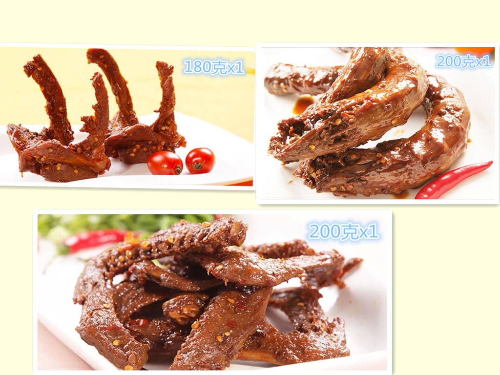 整雞、雞翅、雞爪 ◎豬系列: 豬蹄、豬耳、豬尾、豬腸 ◎素菜系列:豆干、海帶、蓮藕、蘿卜干、云豆、花生、龍蝦、螃血、魷魚(yú)、鵪鶉、整兔、兔頭等。 |